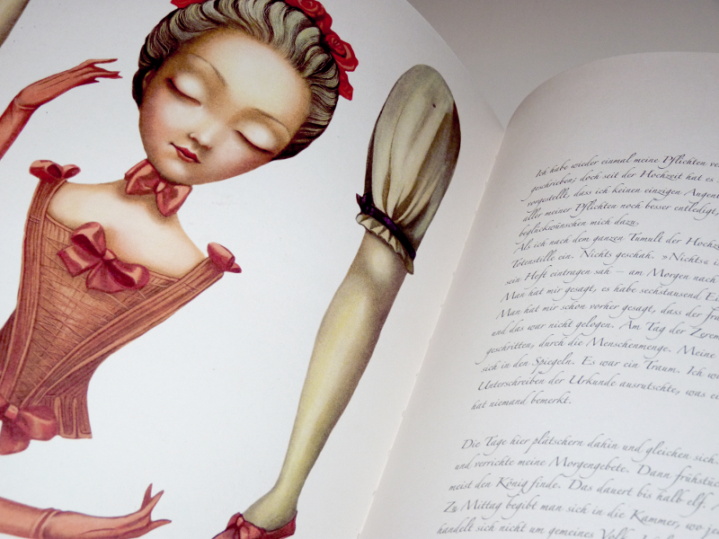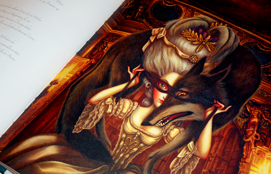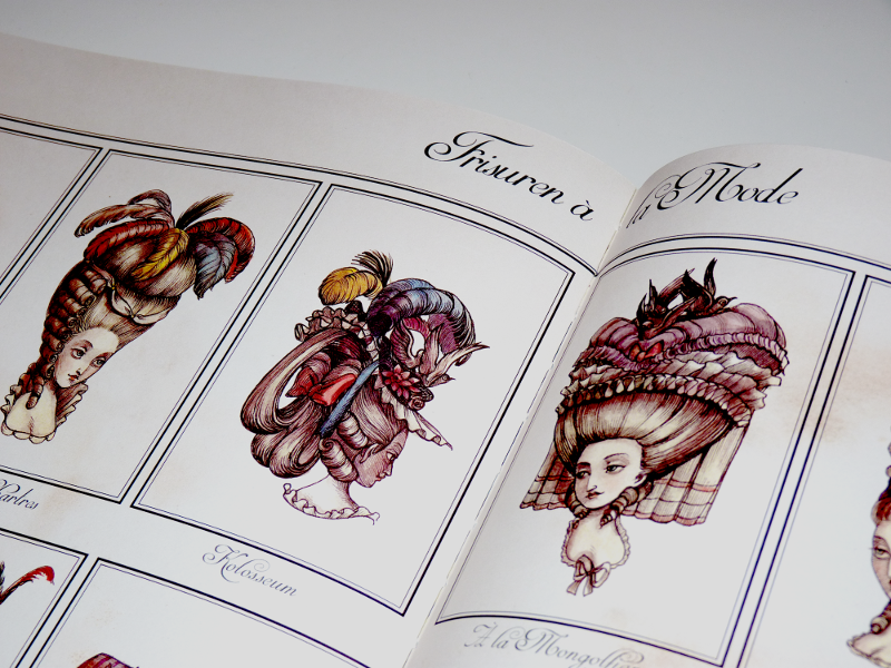 Abgerundet wird das Bild, das wir Leser uns über Marie-Antoinette und ihre Zeit machen, durch die Lieblingsrezepte der Königin, ihr Repertoire an extravaganten Frisuren, Baupläne und satirische Plakate. Doch auch Elemente, die wir bereits aus Lacombes früheren Büchern kennen, haben sich in die diversen Buntstift-, Tusche-, Öl- und Gouachezeichnungen eingeschlichen: Da sind zum Beispiel die beiden Hunde des französischen Künstlers, ohne die keines seiner Bücher vollständig wäre, aber auch die Raben und Kaninchen, die uns beispielsweise in „Schneewittchen“ begegnen. Und weil jedes von Benjamin Lacombes Büchern ein kleines Meisterwerk ist, hat der Künstler den Einband passenderweise in den Rokokofarben Weiß und Grün gehalten, mit royal anmutendem Gold verziert und sich für eine an Stuck erinnernde Reliefoberfläche entscheiden. Beauté en perfection!