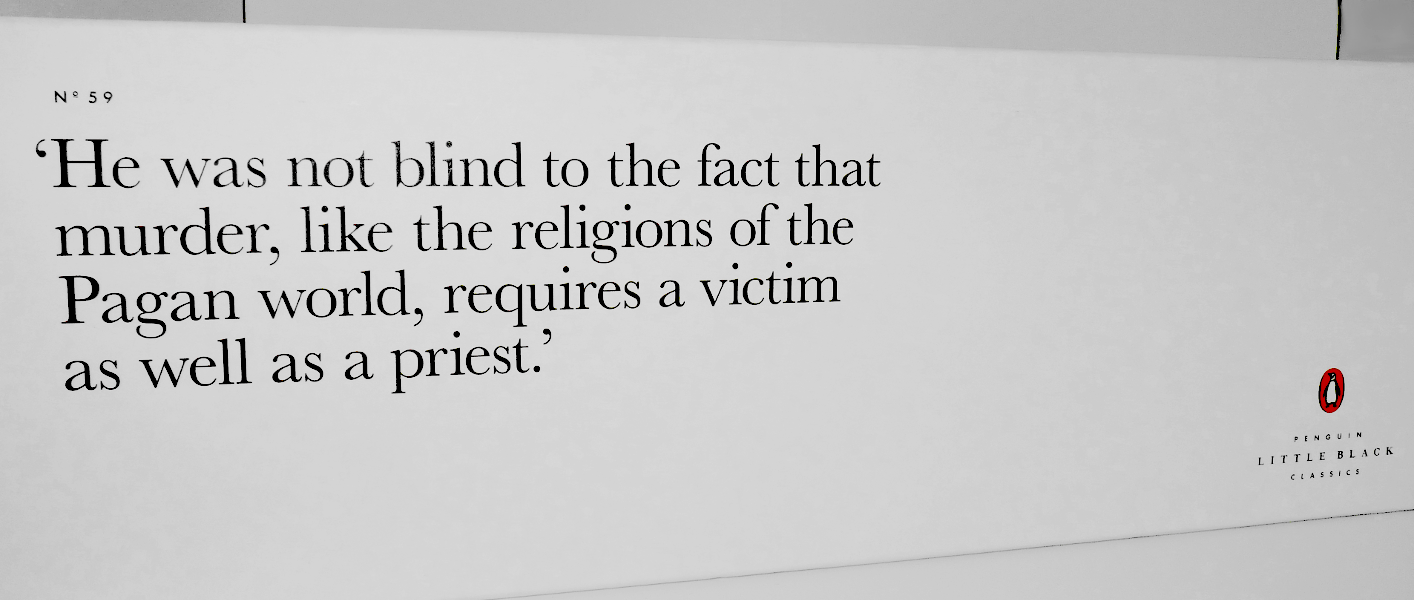 Wer sich, wie ich, nicht auf die Lektüre einzelner Titel der Little Black Classsics beschränken möchte, für den hat Penguin im September einen Schuber mit allen 80 Titeln herausgebracht – der natürlich zum Preis von 80 £ zu haben ist. Zugegeben, von der Verarbeitung her ist der Schuber nicht perfekt: Bei den Buchrücken befinden sich die weißen Balken mit dem Penguin-Logo leider nicht auf einer Höhe und die Länge des Schubers ist so knapp bemessen, dass es nicht einfach ist, ein einzelnes Büchlein aus der Mitte der Reihe herauszunehmen. Aber sieht man von diesen kleinen Makeln ab, wirkt der Schuber in der heimischen Bibliothek ausgesprochen gut. Idealerweise platziert man ihn in einem auf beiden Seiten offenen Raumtrennerregal, denn dann kommt auch die Schuberrückseite zur Geltung, welche ein Zitat aus einem der Little Black Classics ziert – in meinem Fall ein Satz Oscar Wildes.