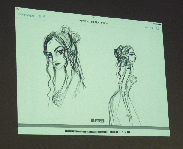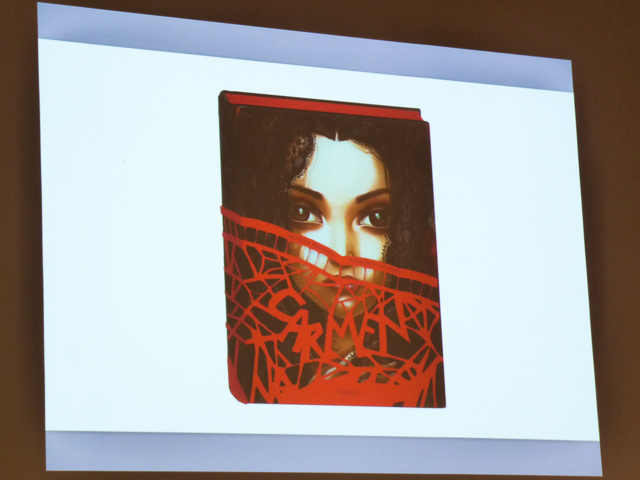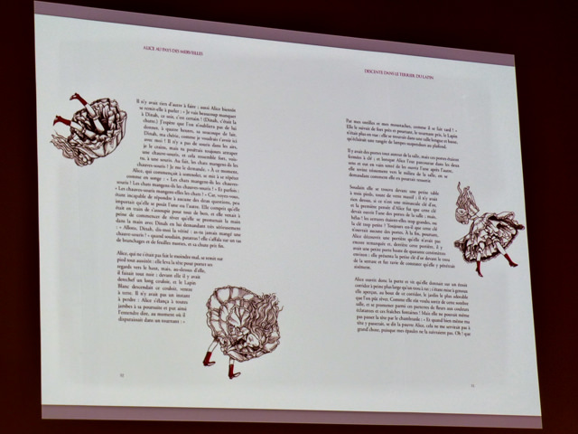 Ein drittes Mal erlebte ich Benjamin Lacombe schließlich im Oktober auf der Frankfurter Buchmesse, wo er zusammen mit seinem spanischen Verleger Edelvives sein neuestes Großprojekt „Carmen“ vorstellte, das auf der gleichnamigen Oper beruht und das er nur in Spanien realisieren kann, da die Geschichte für Frankreich oder auch für andere Länder einfach von weit weniger Relevanz ist. Für den französischen Künstler war es das erste Mal, dass er eine Präsentation zu einem Projekt hält, das noch im Anfangsstudium steckt. Das, was Benjamin Lacombe schon verraten und zeigen konnte, war jedoch vielversprechend. So wird sich die Mehrdimensionalität der Opernbühne (Frontstage, Hintergrundkulisse, Seitenelemente …) im Buch wiederfinden und das Motiv der Spinne wird sich durchs Buch ziehen. Lacombe hat sich für dieses Projekt auch sehr viel Neues aneignen müssen, beispielsweise die Fächersprache, die für Epoche der Geschichte ein bedeutendes Element repräsentiert. Neben „Carmen“ zeigte uns Benjamin Lacombe auch Auszüge aus der von ihm illustrierten Ausgabe von „Alice im Wunderland“, die definitiv eines meiner Highlights im Buchregal wird.